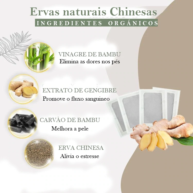 O adesivo desintoxicante para os pés contém ingredientes naturais que estimulam os pontos de acupuntura através da ação combinada do gengibre e do vinagre de bambu.